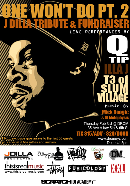 For the unofficial start of J-Dilla month Q-Tip, T-3 and Illa J will be performing on Thursday February 3, 2011 at DROM. Mick Boogie and DJ Metaphysic on the wheels. $15 in advance/$20 at the door.
